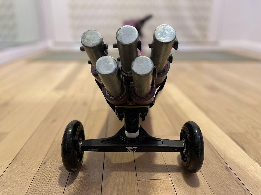 Through the years I've tried all sorts of things: wheeled keyboard cases; rifle cases; snowboard bags, kiteboard bags, and even some weird rope stuff that might even qualify as shibari. The best thing thus far was still a good Cyr bag (my favorite to this day being the Spinnovation "bucket bag"). But those still required schlepping the damn thing over your shoulder, and we all know what a pleasure that can be. My other NYC Cyr peers know the struggle well.